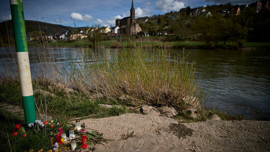 Kerzen und Blumen liegen am Koberner Moselvorgelände. In der Nähe sind ein Großvater und seine vier Jahre alte Enkeltochter bei Kobern-Gondorf in der Mosel ertrunken.