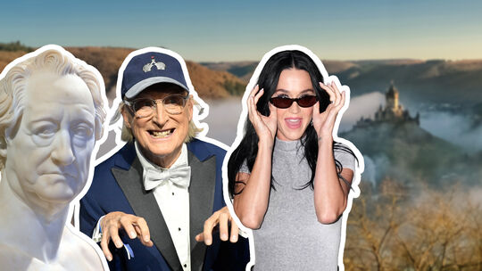 Illustration mit Göthe, Otto Waalkes und Katy Perry vor einer Landschaftsaufnahme der Stadt Cochem. Kevin Rühle. Fotos: dpa/Jonathan Brady, Marti