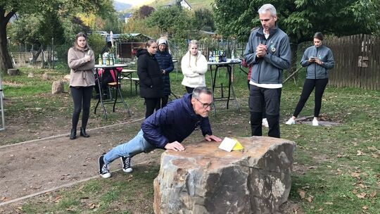Markus Dax (im Liegestütz) und Peter Raueiser (rechts daneben) vom TV Cochem demonstrierten an den Bewegungssteinen mögliche Übungen. Johannes Kirsch