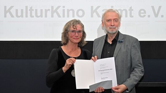 Birgit Theresa Koch vom Kulturkino in Zell-Kaimt nimmt den Programmpreis im Empfang. Werner Dupuis