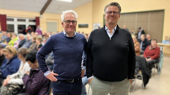 Investor Bart Rooijman (VDL Eindhoven) und Betreiber Don van Schaik (rechts) stehen den Einwohnern von Kennfus Rede und Antwort zum geplanten Ferienpark Falkenlay. Ulrike Platten-Wirtz