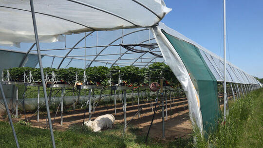 Moment herrscht bestes Erdbeerwetter: Unter langen Zeltbahnen wachsen die Erdbeerpflanzen des Rosen- und Beerengartens Polcher Holz in Taillenhöhe, sodass sie bequem geerntet werden können. Elvira Bell