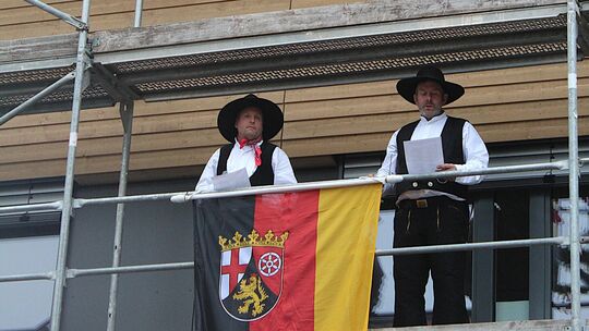 Zwei Zimmermänner sprechen auf einem Gerüst an der Fassade des neuen LBM-Gebäudes in Cochem den Richtspruch. Ulrike Platten-Wirtz