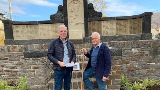 Müdens Ortsbürgermeister Franz Oberhausen, links, freut sich mit dem Dorfchronisten Rudolf Bertgen über die gelungene Neugestaltung des Gefallenendenkmals nahe der Müdener Kirche und die zahlreichen Spenden aus der Bevölkerung. Heinz Kugel