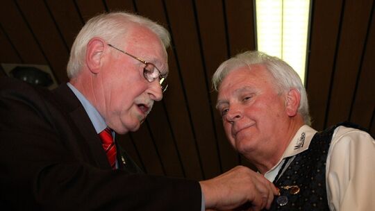 Die Nadel ans Revers geheftet: Robert Michels, Vorsitzender des Kreismusikverbandes Cochem-Zell (links) ehrt Karl Fuhrmann. Seit 35 Jahren schwingt Fuhrmann den Taktstock im Musikverein Müllenbach. Dafür überreicht Michels ihm die Dirigentennadel in Gold.