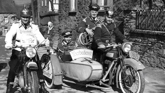 Fastnacht 1957 in Gillenbeuren und die Bundeswehr: Was haben die miteinander zu tun? Mehr als man denkt! Wie heute brauchte die Bundeswehr auch damals Personal. Hermann Bäcker (von links), Artur Phasen, Josef Bauer und Ewald Laux hatten sich im Fastnachtsumzug auf ihren Motorrädern als Feldgendarme und 08/15-Militärpolizei zum „Werbedienst“ aufgemacht.
