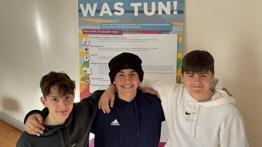 Linus, Jamil und Tristan (von links) sind Schüler der IGS Zell. In der Ausstellung "Rechtsaußen - Mittendrin", die derzeit in Blankenrath im Bürgerhaus zu sehen ist, befassen sie sich mit dem Thema Rechtsextremismus. Birgit Pielen