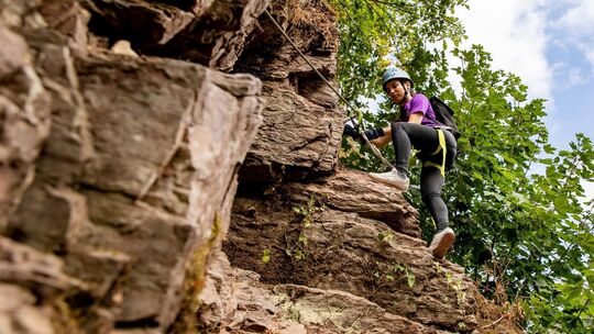 Wer sich am Klettern versuchen will, der ist auf dem Manderscheider Burgenklettersteig richtig. Die letzte Kletterkurse für dieses Jahr finden im Oktober statt. ⋌Foto: Gesundland Vulkaneifel/phormat.de/Andi Goltz rw-system