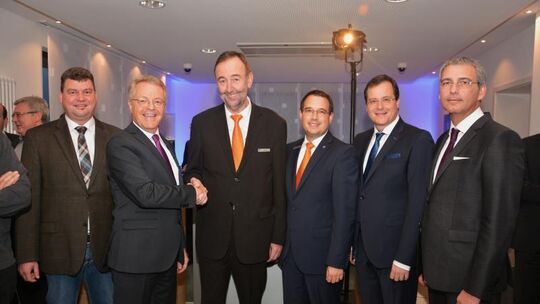 Vorstandsvorsitzender Elmar Schmitz gratuliert zur Eröffnung dem Geschäftsstellenleiter Josef Mais (von links): Stadtbürgermeister Thomas Kerpen, Elmar Schmitz, Josef Mais, Regionalmarkt Eifel-Direktor Thomas Klassmann und die Vorstandsmitglieder Markus Müller und Sascha Monschauer. Foto: Helmut Gassen