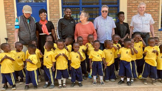 Es ist Hilfe, die Hoffnung schenkt: Davon haben sich Matthias Müller (3. von rechts) und Wolfgang Thiel (rechts) überzeugt. In Byumba unterstützen sie das Ehepaar Ohly bei einem Schulprojekt. Die Koblenzerin Ursula Ohly (Mitte) wurde für ihr Engagement in Ruanda 2022 mit der Verdienstmedaille des Landes Rheinland-Pfalz ausgezeichnet. Kunga-Ruandahilfe/Matthias Müller