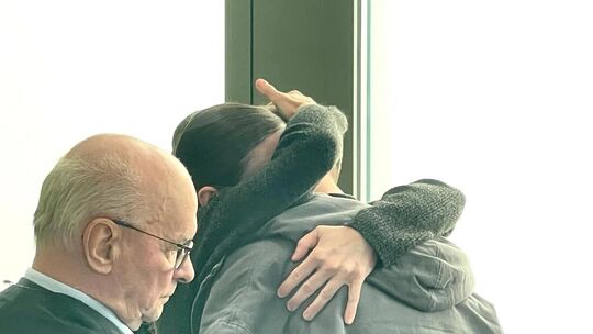 Die ehemalige Lebensgefährtin des Mordopfers umarmt während des ersten Prozesses am Trierer Landgericht im Gerichtssaal ihren mitangeklagten Sohn; mit im Bild ihr Verteidiger Walter Teusch. Rolf Seydewitz