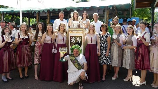 Weinkönigin Jule, Weinprinzessin Jana, Weingott Bacchus Paul im Schlepptau und weitere Weinmajestäten aus der Region eröffnen das Senheimer Weinfest – mit Schirmherr Christoph Tesche und Ortschef Volker Ahnen. Foto: Esser