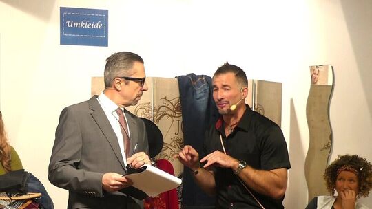 Verkaufsleiter Gino (rechts) weiß sich vor dem nervigen Unternehmensberater Carsten Maschmaurer eindrucksvoll in Szene zu setzen und füttert ihn zunächst mit haarsträubenden Fake News. Thomas Esser
