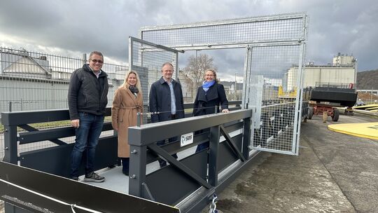 Oberbürgermeister Jan Einig (2. von rechts), Stadtmarketing-Leiterin Julia Kloos Wieland (1. von rechts), SBS-Andernach Geschäftsführer Alexander Friesen (1. von links) und Stadt-Tourismusexpertin Lena Höver (2. von links) besuchen die neue Landebrücke für den Schiffsanleger. Ulf Steffenfauseweh/Stadt Neuwied