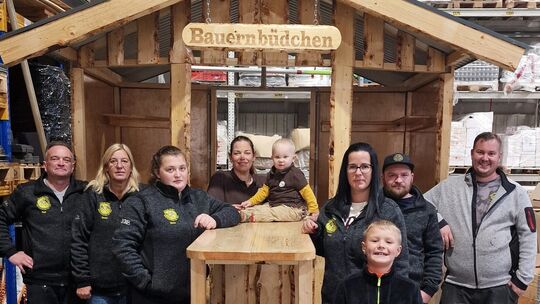 Alisha Hammerstein (Mitte), Besitzerin des Bauernstübchens, hat mit Helfern und Freunden das Bauernbüdchen gebaut. In der Holzhütte wird sie Besuchern des Martinszugs durch Arienheller wärmende Speisen und Getränke anbieten. Andreas Winkelmann