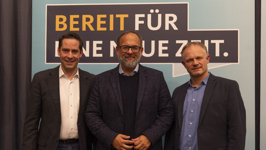 Moritz Petry, Geschäftsführer des Gemeinde- und Städtebundes Rheinland-Pfalz, mit Gastgeber und Landtagskandidat Jan Petry und Neuwieds Oberbürgermeister Jan Einig (von links) bei der Diskussionsveranstaltung in Puderbach. Rainer Claaßen