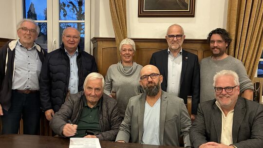 Im Unkeler Ratshaus besiegelten Gerald Muss (2. von links, stehend) Bernd Kruse (vorn links) und Dirk Sterenborg (vorn Mitte) mit ihrer Unterschrift unter die Verträge, den Bau des neuen Kunstrasenplatzes. Sabine Nitsch