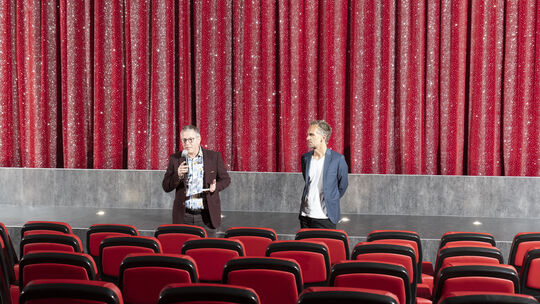 Michael Mertes vom Stadtjugendamt und Michael Schwarz, Regisseur des Films, bei der Ankündigung im Kinosaal. Rainer Claaßen