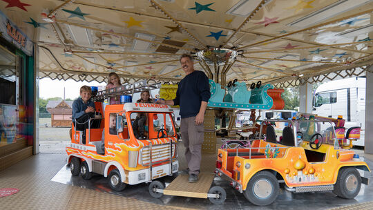 Noch dürfen nur die Enkelkinder von Peter Heinen auf den bunten Fahrzeugen seines Kinderkarussells Platz nehmen, ab Donnerstag drehen sich die Mobile auch für viele andere kleine Fahrgäste. Rainer Claaßen