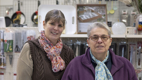 Heike und Doris Fücker hinter der Theke ihres Ladens, Haushaltswaren Fücker in Heddesdorf, hier fühlen sie sich wohl. Rainer Claaßen