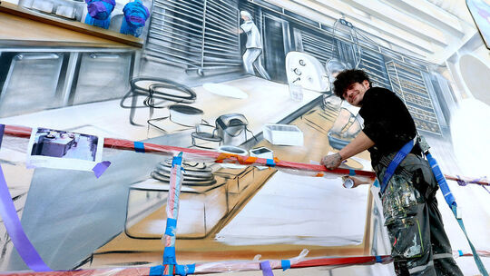 Kunstwerke auf Hausmauern sind oftmals viel beachtete Blickfänge. Zu einem solchen wird sicher auch das Bild, dass Alexander Heyduczek derzeit auf die Fassade der Bäckerei Preißing bringt.