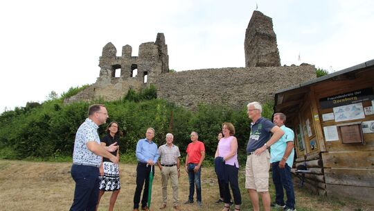 Christoph Kurz (1. von links), Geschäftsführer des Vereins Freundeskreis der Isenburg, erklärt unter anderem Isabelle Fürstin zu Wied (2. von links), den Bundestagsabgeordneten Erwin Rüddel (3. von links), Tabea Rößner (3. von rechts) und auch der Kreis-Grünen-Politikerin Bettina Sagebiel (4. von rechts) mehr über die geplante Baumaßnahme. Auch berichtete er über vergangene Maßnahmen. Fotos: Lars Tenorth Lars Tenorth