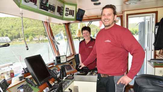 Geschäftsführerin Rita Hirzmann und Fährführer Markus Stahl-Popovic üben ihren Beruf auf dem Rhein aus. Foto: Simone Schwamborn