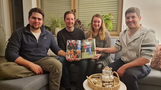 Hendrik Müller (von links), Korbinian Wester, Melanie Bauch und Jan-Philipp Wallek mit der Vereinschronik Andreas Winkelmann