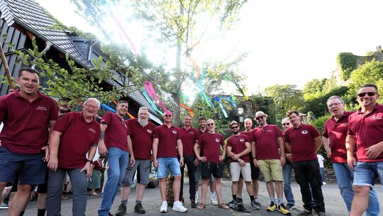Wenn die ehemaligen Burschen ihre Arbeit erledigt haben und den Kirmesbaum am Fuße der Burgruine aufgestellt haben, dann können die Kirmesfeierlichkeiten auf dem Blächplatz am Wiedufer beginnen. Schon der von Achim Wilms vorgetragene Kirmesspruch machte Lust auf die anschließende Open-Air-Party mit Jens Hauschild an der Musikmaschine.
