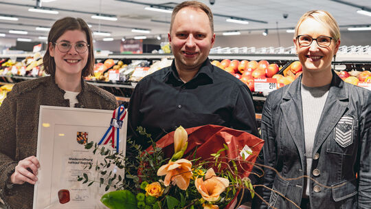 Gratulierten dem Inhaber Johann Rogalsky zur Eröffnung des Nahkauf-Marktes am Sohler Weg: Alexandra Rünz von Neuwieds Wirtschaftsförderungsgesellschaft (links) und Kristina Kutting von der IHK. Rogalsky. J. Rogalsky