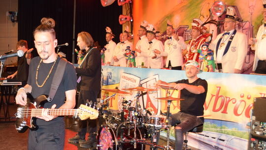 Danach ging es weiter mit J. P. Weber, der mit Volker Weininger und Martin Schopps als „Das Herrengedeck“ gern gebucht wird. Weber ist wie der Windhagener Sitzungspräsident Mitglied der Kölner Karnevalsgesellschaft Kajuja. Anders als bei der Mädchensitzung brillierte er am Sonntag mit einer Büttenrede, in der er auch kritisch auf das Gendern und die aktuelle politische Situation in Deutschland einging, obwohl er nach eigenem Bekunden keine Ahnung von Politik habe. Natürlich spielte er auch seiner „Flitsch“ (Mandoline) bekannte kölsche „Leedcher“, die von ihm komponiert und von den Männern im Saal als 850-stimmiger Männerchor intoniert wurden. Die Band Klüngelköpp unterhielt danach mit ihren bekannten Hits, zu denen auch der neue Titel „Loreley“ gehört.