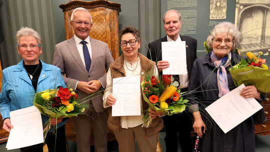 Die Geehrten Margret Heßler (links), Anna Scharenberg (3. von links), Heinz-Jürgen Dröge (2. von rechts) und Edeltraud Billinger (rechts) mit Landrat Achim Hallerbach (2. von links). Jörg Niebergall