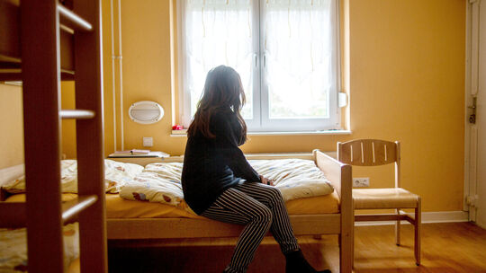 Eine Frau sitzt im Frauenhaus auf einem Bett. Die Landesregierung in Mainz hat für eine neues Frauenhaus im Kreis Neuwied grünes Licht gegeben. Maja Hitij. dpa