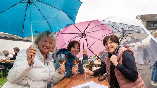 Die Weinlaune ließen sich die Frauen aus Andernach beim Emmausgang in Leutesdorf vom Regen nicht verderben. Heinz-Werner Lamberz