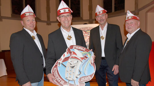 Adjutant Ralf Rondi, Prinz Norbert Adams, Adjutant Horst Schreiber und Adjutant Michael Nietzard (von links) präsentieren das Prinzennädelchen. Foto: Simone Schwamborn Simone Schwamborn