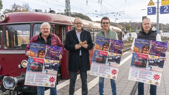 Stellten das neue Konzept "Weihnachtsmarkt Hopping mit der Kasbachtalbahn" in Linz vor (von links): Gary Blackburn, Stadtbürgermeister Helmut Muthers, Peter Runkel und Jörg Seyfert. Heinz-Werner Lamberz
