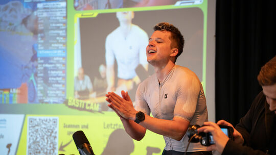 Die zwölf Stunden auf dem Rad sind geschafft, Sebastian Trimborn hat den Weltrekord geknackt. Daniela Trimborn
