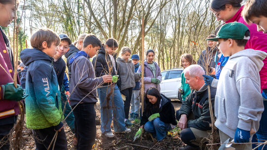 Forstarbeiter Klaus Neiß erklärt den Kindern der Bad Hönninger Marienschule, wie ein Baum richtig gepflanzt wird. Heinz-Werner Lamberz