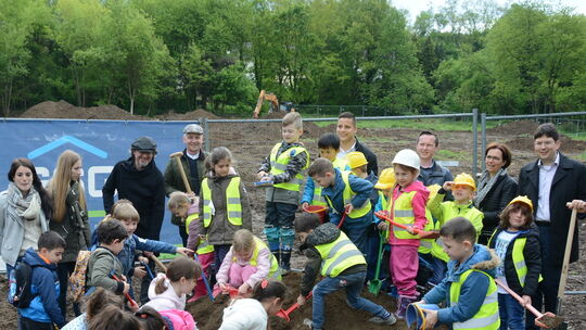 Neuwied. In Neuwied gibt es deutlich zu wenig Kindergartenplätze, die Stadt kann die rechtlichen Ansprüche nicht erfüllen. Deshalb läuft schon seit ein paar Jahren ein ambitioniertes Ausbauprogramm, das maßgeblich die städtische Siedlungsgesellschaft GSG umsetzt. Jetzt beginnt innerhalb dieses ein wesentlicher weiterer Schritt: der Neubau eines Kindergartens in Niederbieber – des dann vierten im Stadtteil – für insgesamt sechs Gruppen. Am Freitag setzten GSG-Geschäftsführer Carsten Boberg, Bürgermeister Michael Mang, Architekt Edgar Zimmermann sowie Mädchen und Jungen aus dem Kinderschiff (Innenstadt) und der Villa Kunterbunt (Engers) den symbolischen ersten Spatenstich.