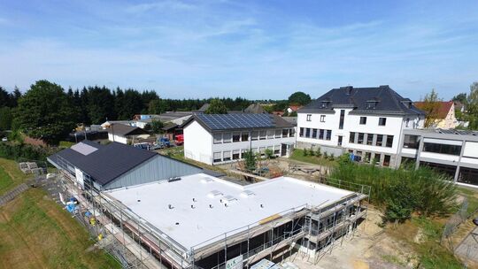 Der Anbau ans Clubhaus in Straßenhaus (vorne) steht bereits. Derzeit läuft der Innenausbau. Foto: Jörg Niebergall