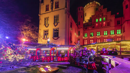 Für den Weihnachtsmarkt erstrahlt Schloss Arenfels bunt. In diesem Jahr können kleine Besucher das magische Ambiente von einer Eisenbahn auf dem Innenhof bestaunen. Heinz-Werner Lamberz