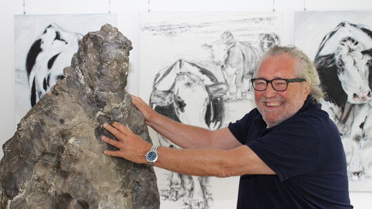 Der Dierdorfer Künstler Uwe Langnickel vor seinen Kühen und mit einem Abbild von ihm von einem anderen Künstler, erzählt gerne von 1968.