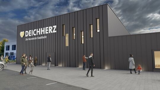 Das „Deichherz“ wird Neuwieds neue Eventhalle. Die ersten Bauteile stehen bereits. Eine Visualisierung zeigt nun die spätere Optik des Gebäudes. SWN/Markenliebe