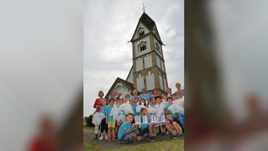 Die Vorstandsmitglieder des Kirchbauvereins mit den Vorschulkindern der Evangelischen Kita Torney. Sie haben im Rahmen ihrer Projekttage Schlossgespenster und Modelle des Kirchturms gebastelt.