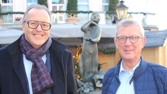 Bürgermeister Helmut Muthers (links) und Dieter Lehman, von der Arbeitsgruppe Rheintor vor dem Strünzerbrunnen mit der Bronzefigur des Linzer Strünzers. Sabine Nitsch