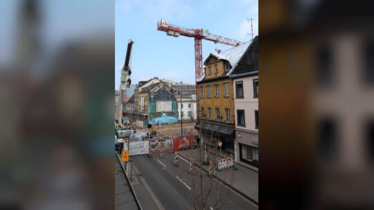 Straße in der Innenstadt gesperrt: Sparkasse Neuwied errichtet Kran auf ihrer Baustelle