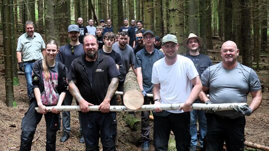 Das Kirmespaar Natalie Stein (links) und Max Arnold (2. von rechts) packte beim Baumholen mit an. Jörg Niebergall