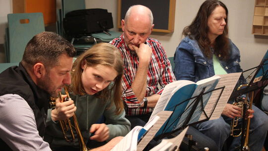 Im evangelischen Posaunenchor Urbach hilft jeder jedem, zum Beispiel wenn es in der jeweiligen Instrumentengruppe (hier die Trompeten) Fragen zu neuen Stücken gibt. Julia Hilgeroth-Buchner
