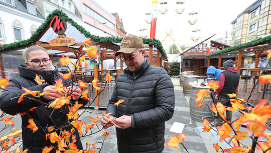 Die letzten Vorbereitungen für den Knuspermarkt laufen, Carina Elzer und Philipp Meyer kümmern sich um die neuen Stehtischbäumchen. Jörg Niebergall