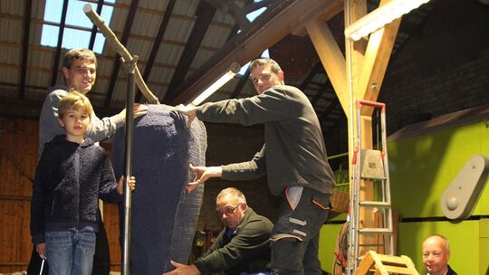Wolfgang Willscheid (links), unterstützt durch Sohn Tim, baut mit den Kameraden der Feuerwehr den Wagen für den Erntedank- und Winzerfestzug in Dattenberg. Foto: Sabine Nitsch Sabine Nitsch